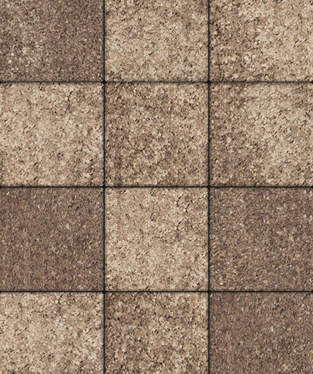 Изготавливается по уникальной технологии методом полусухого вибропрессования из бетона. Брусчатка Квадрат 300х300 отличается высокой износостойкостью и практичностью в эксплуатации. Поверхность выполнена с оригинальной зернистой фактурой бело-бежево-коричневого цвета. Натуральная Гранитная крошка в лицевом слое изделий наделяет плитку приятной шероховатостью, а также устойчивостью к скольжению. Для прокраса плиты в нескольких цветах применяется технология введения пигмента в бетон Colormix. Два или три пигмента, нанесённые хаотично, образуют неповторимый рисунок на поверхности изделия. Чтобы избежать цветовых пятен или разрывов рекомендуется выполнять укладку плиты с соблюдением правила пяти или трех поддонов.