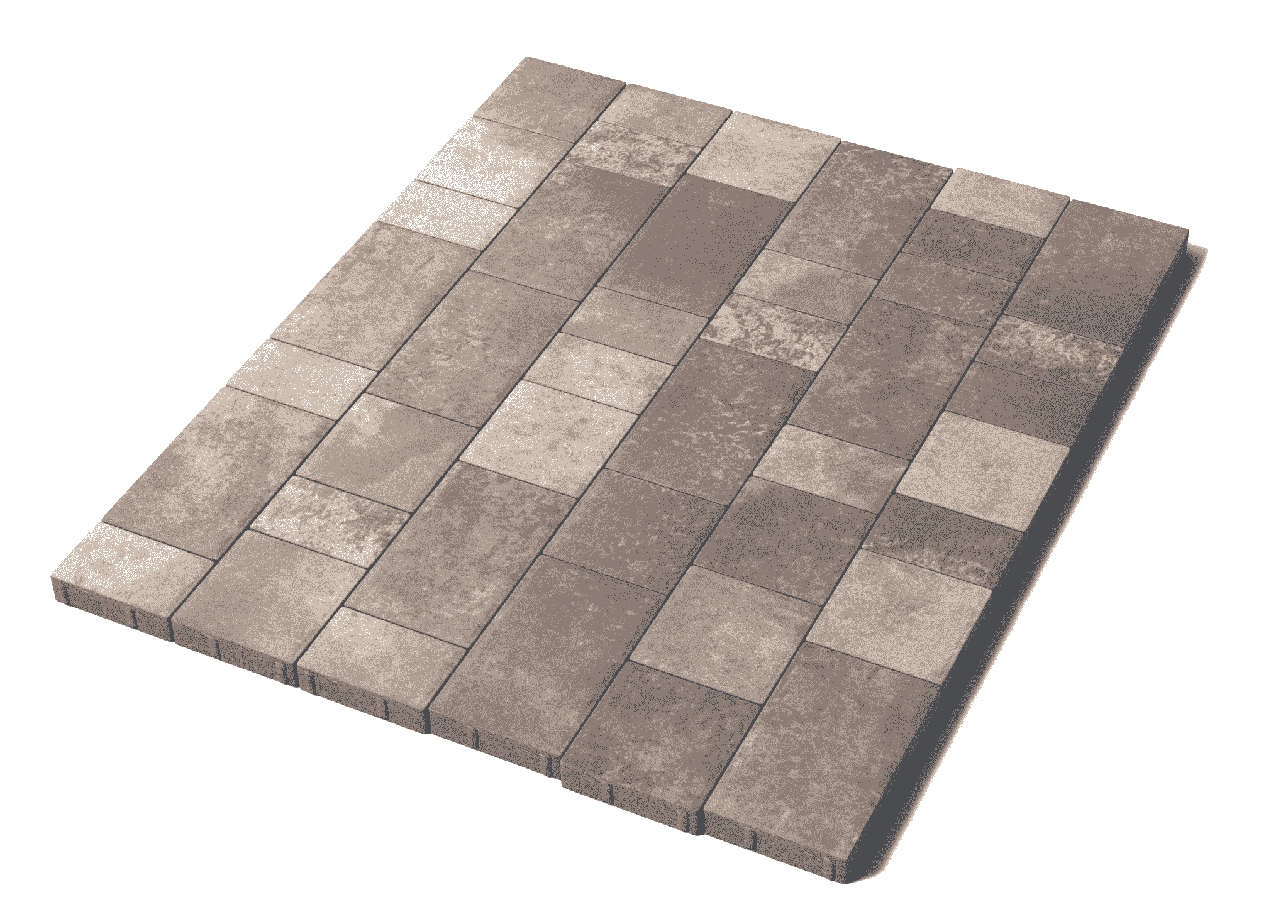 Состоит из 3-х элементов, которые выкладываются в хаотичном порядке рядами. Изготавливается по уникальной технологии методом полусухого вибропрессования из бетона. Поверхность бело-бежево-коричневого цвета.