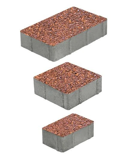 Состоит из 3-х элементов, которые выкладываются в хаотичном порядке рядами. Изготавливается по уникальной технологии методом полусухого вибропрессования из бетона. Поверхность выполнена с оригинальной зернистой фактурой красно-оранжевого цвета. Натуральная гранитная крошка в лицевом слое изделий наделяет плитку приятной шероховатостью, а также устойчивостью к скольжению. Для прокраса плиты в нескольких цветах применяется технология введения пигмента в бетон Colormix. Два или три пигмента, нанесённые хаотично, образуют неповторимый рисунок на поверхности изделия.