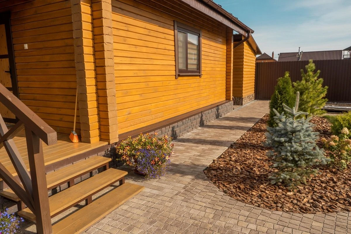 - Для отмостки возле бани была использована тротуарная плитка Прямоугольник 100*200 мм. в коллекции Листопад Гранит, цвет Хаски.