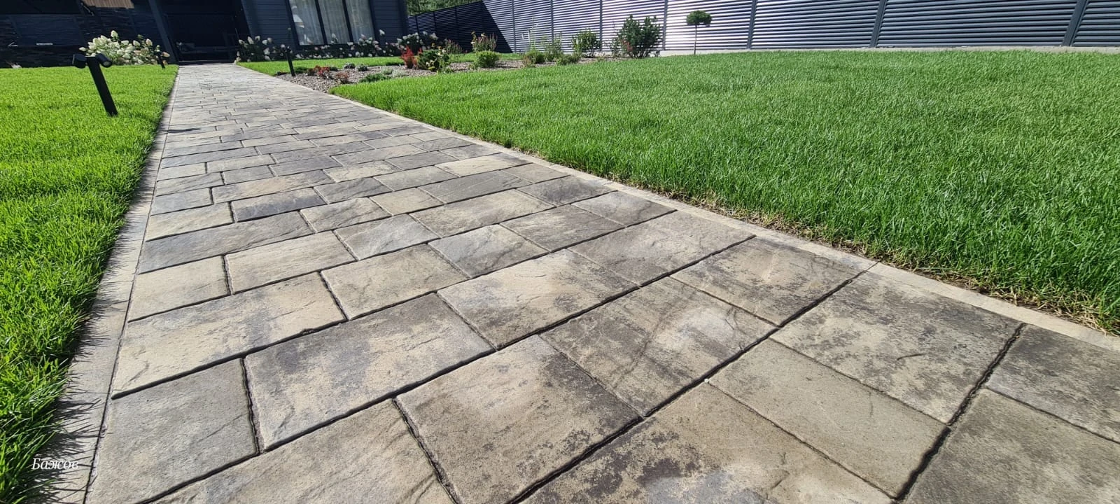 Для этих работ идеально подошли тротуарная плитка Литос в цвете Шунгит, а также бордюры в этом же цвете. Дорожки выполнены в строгом геометрическом формате с прямыми углами, ширина выбрана таким образом, чтобы как минимум два человека могли с легкостью идти рядом или разойтись на дорожке.