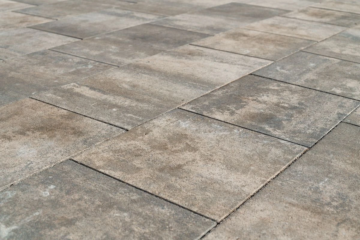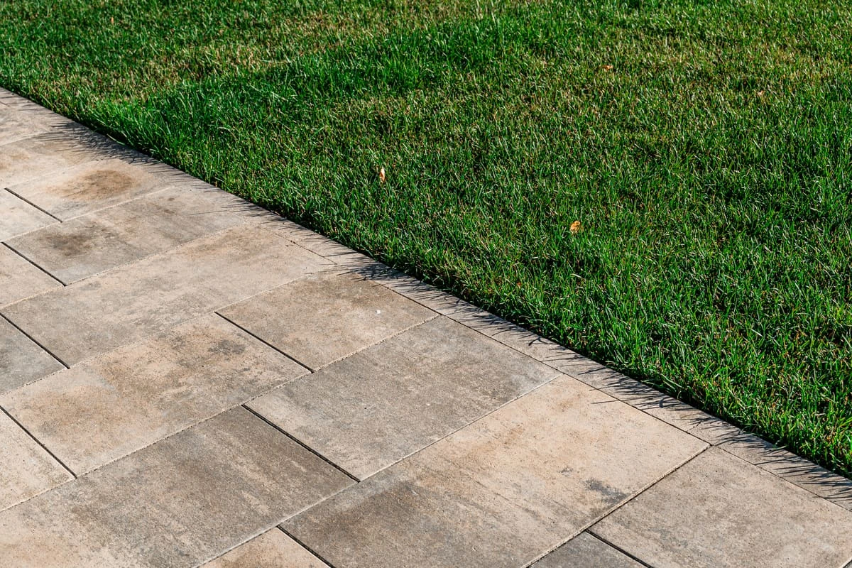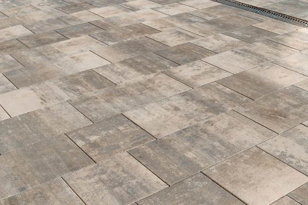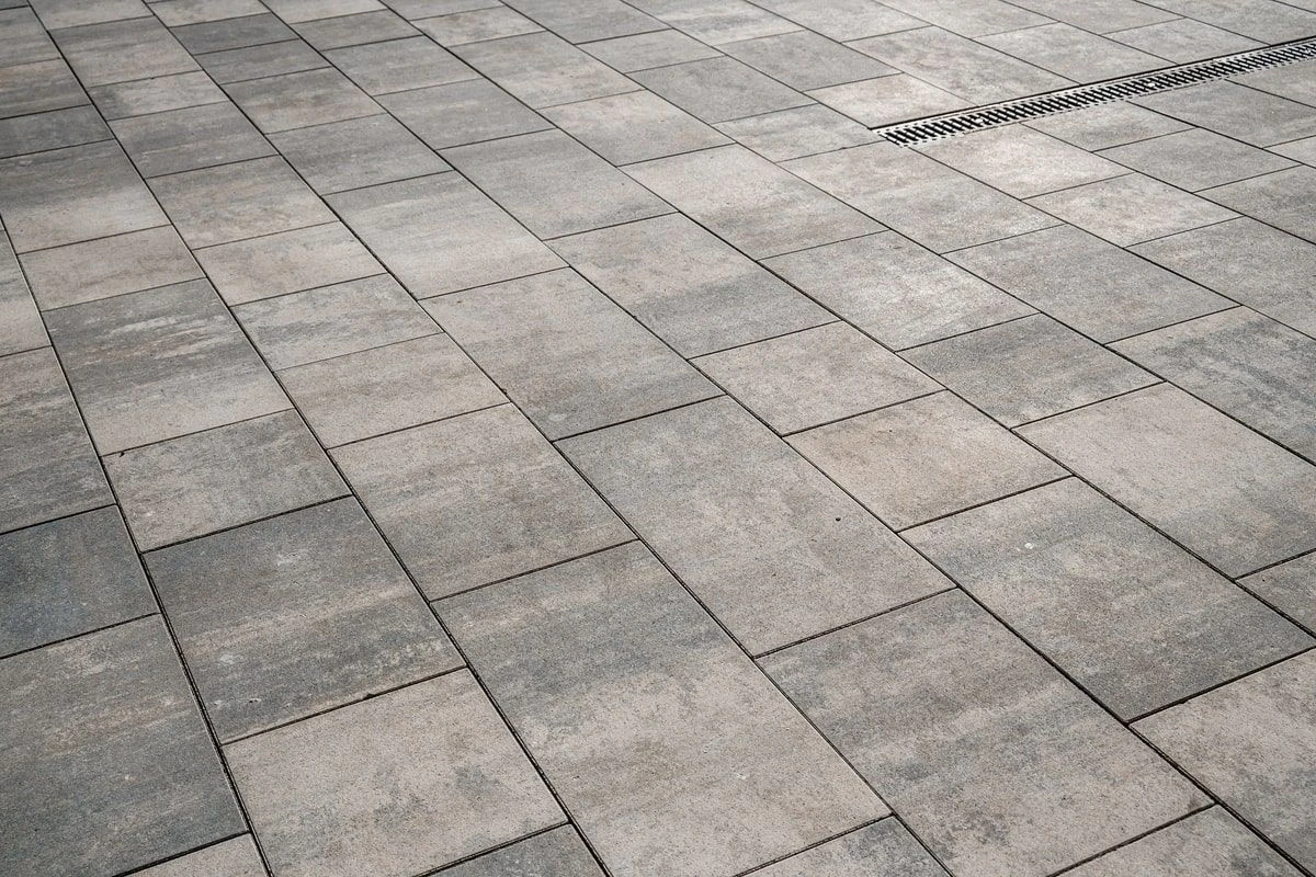 Для мощения территории частного дома была выбрана брусчатка Трио в толщине 60 мм. Комплект состоит из 3-х плит: 300х300 мм, 450х300 мм, 600х300 мм. В результате укладки плитки получается необычный узор. В дополнении к плитке Трио был использован бордюр-поребрик в цвете Габбро.