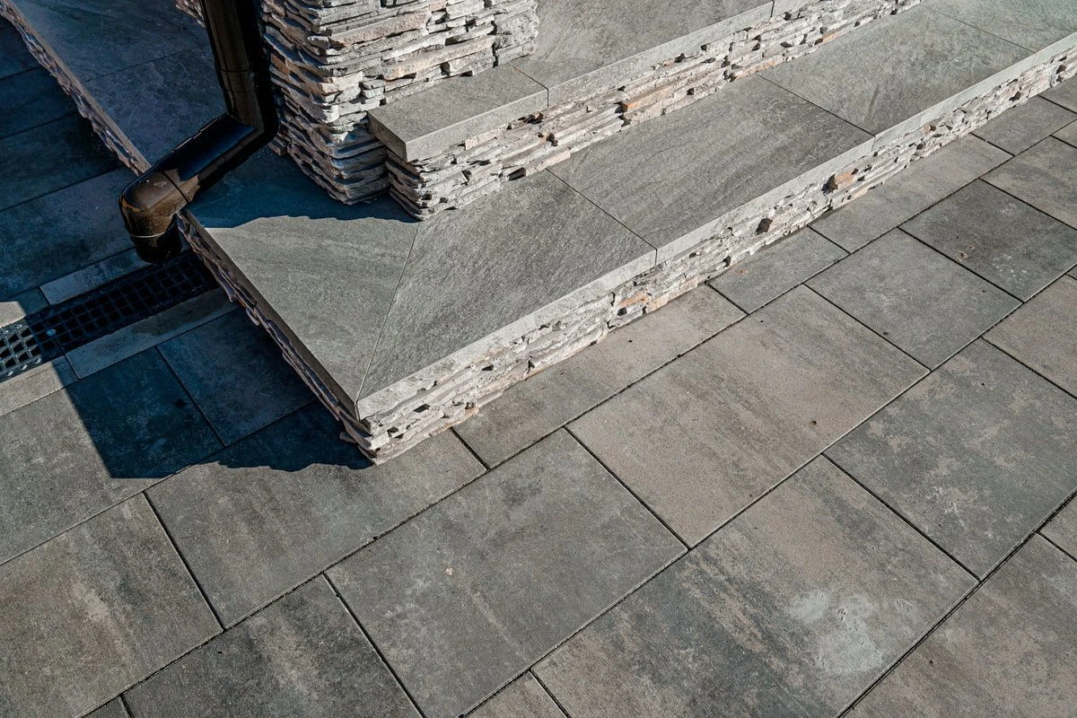 С помощью плитки была выполнена отмостка возле дома, въезд в гараж и парковочное место, входная группа у крыльца. Материалы подобраны таким образом, чтобы создать нестандартную текстуру без необходимости микса разных коллекций плитки.