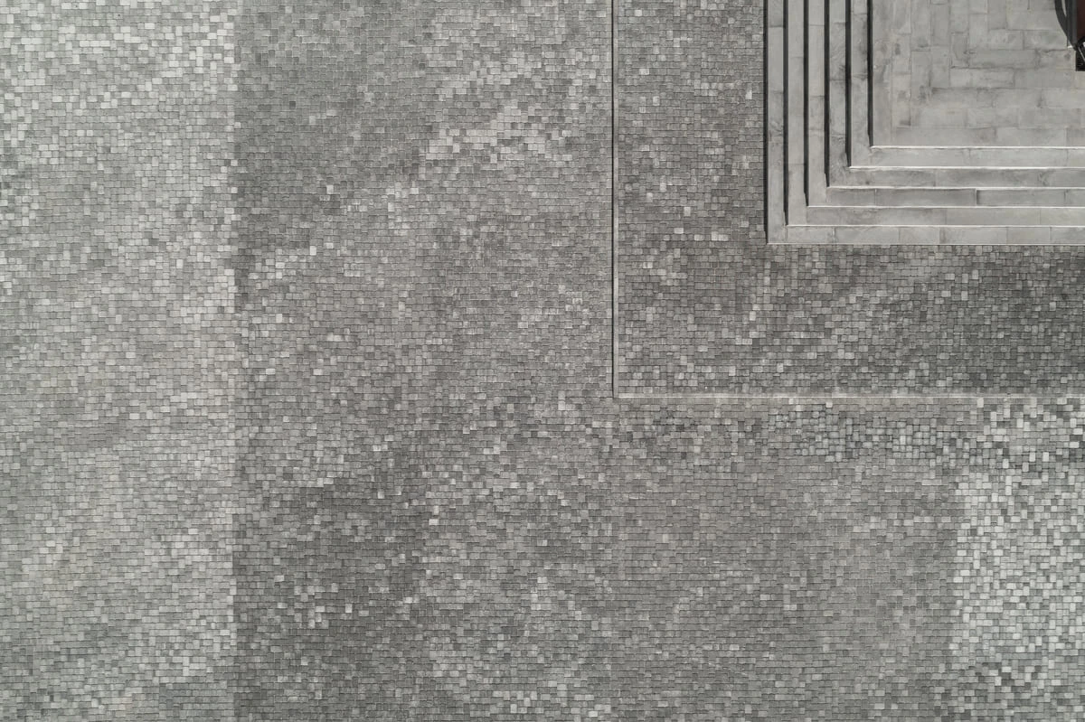 Благоустройство территории начато в 2022 году. Основой мощения стала плита Классико, Листопад Гранит, цвет Антрацит.