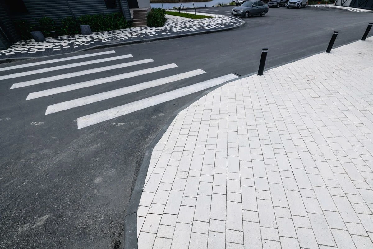 Основной рисунок выстроен с помощью хаотичной разбивки черного и белого цвета, но в местах ближе к дороге или дому плитка переходит в один цвет — черный или белый. Это визуально отделяет прогулочную зону от всех остальных, при этом подобранные цвета гармонируют с постройкой.