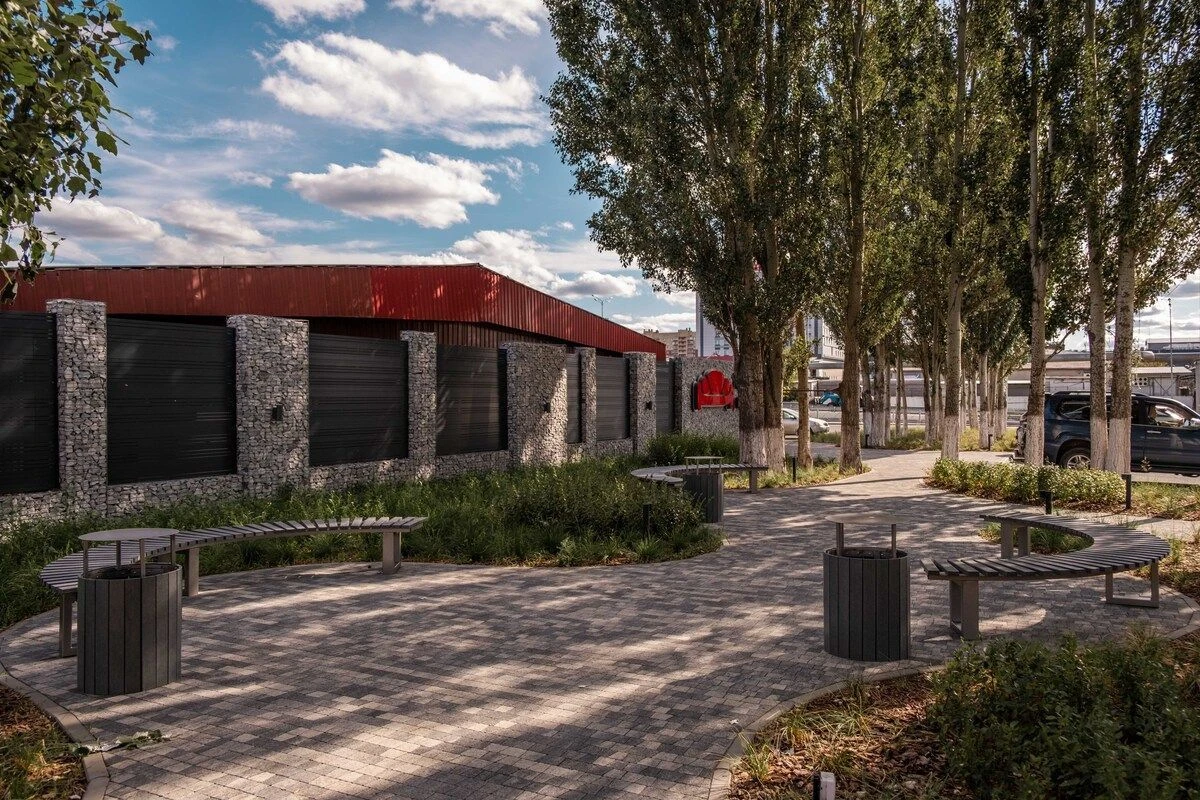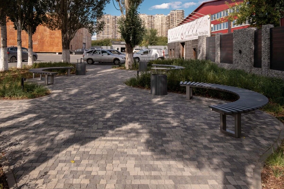 Для оформления территории использована тротуарная плитка «Поревит» Абрис, Листопад Гранит, Антрацит и радиусные бордюры серого цвета. Плитка градиентного черно-белого цвета уложена методом пяти поддонов для равномерного распределения без цветовых пятен. Далее после создания дорожек были установлены скамейки и урны, которые дополнили пространство.