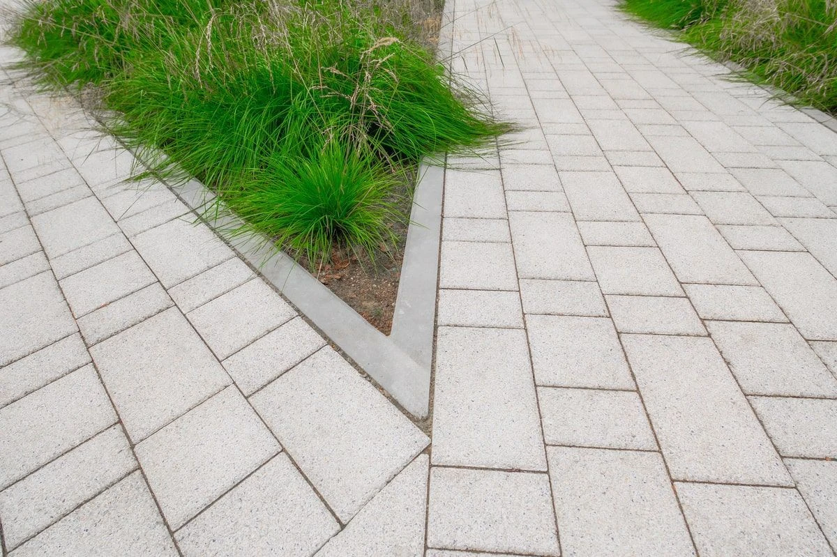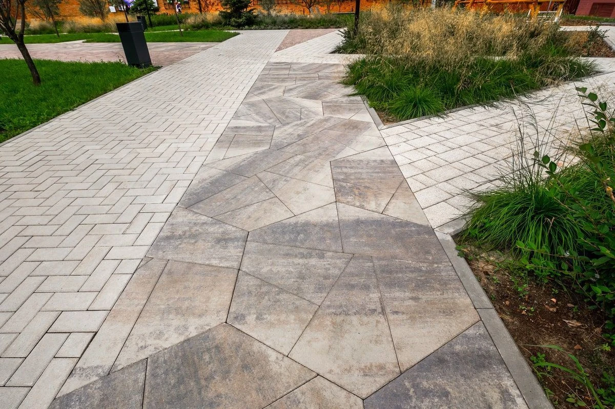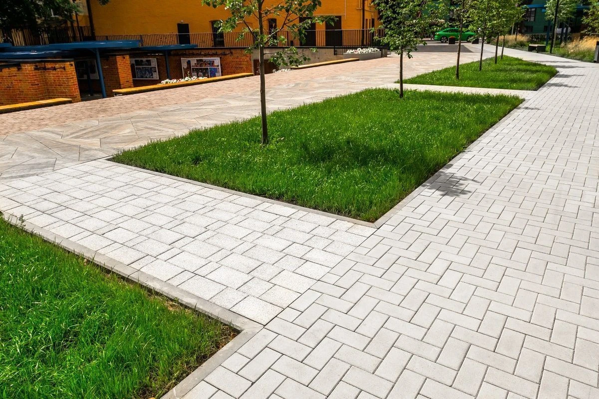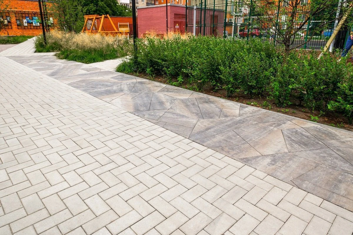 Для реализации дорожно-тропиночной сети использована тротуарная плита: Мозаика, Старый город, Классико. В светлых тонах: белый, серый и бежевый.