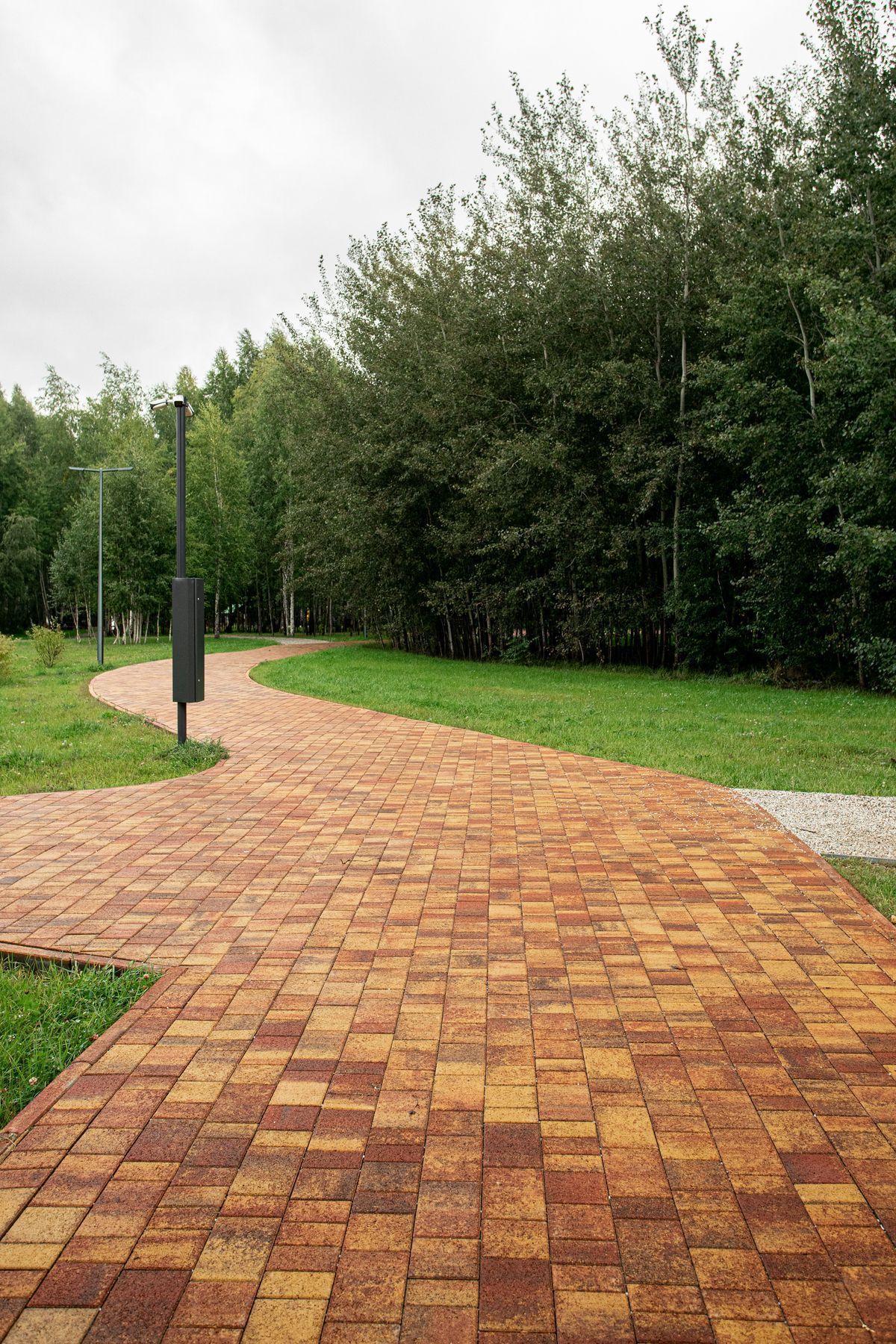Для пешеходных дорожек в парке использована в том числе тротуарная плитка "Поревит": Арбор в цвете Орех и Старый город в цвете Осень.