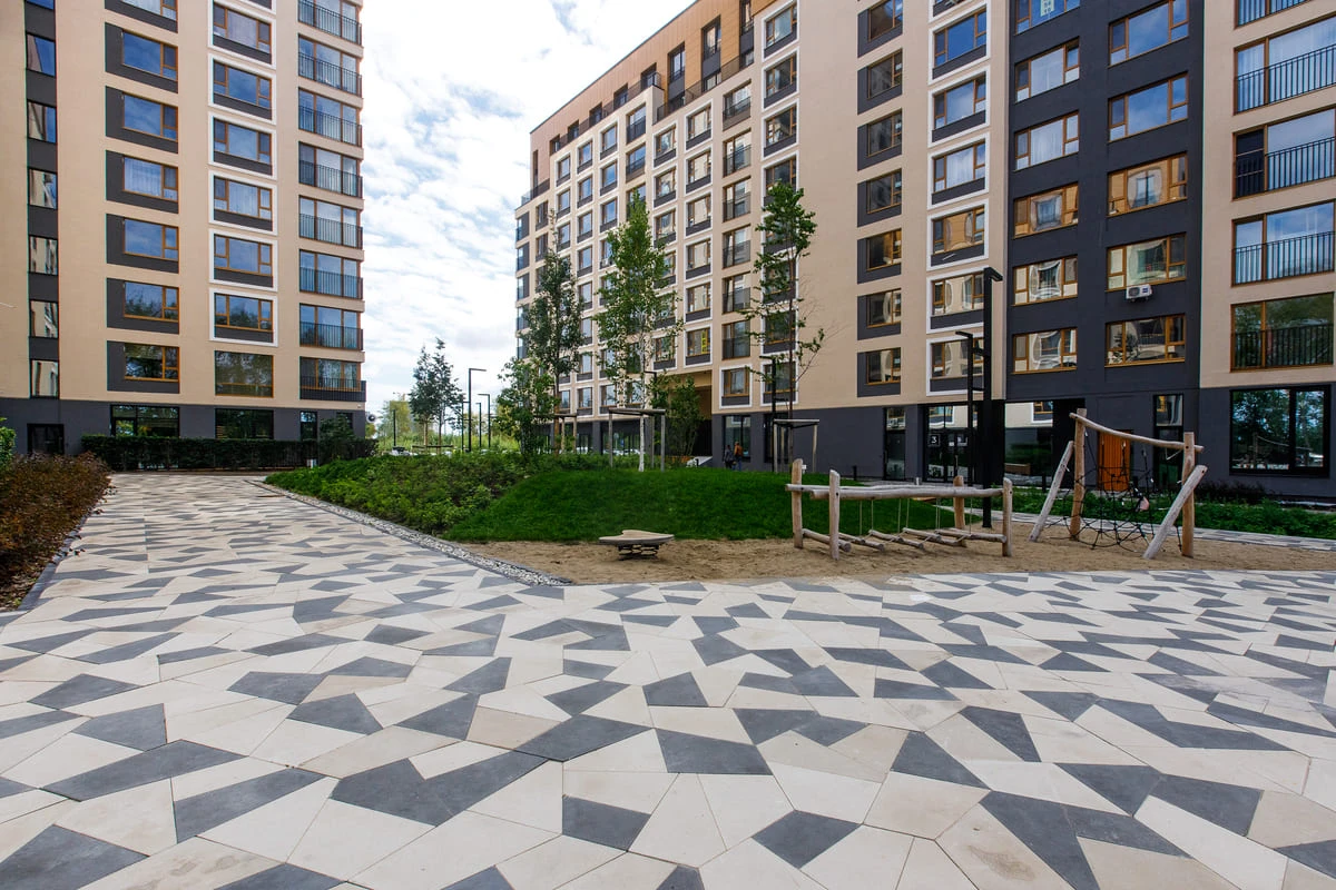 Для благоустройства Жилого комплекса "Октябрьский" использована тротуарная плитка Мозаика, Стандарт, цвет белый и черный.
