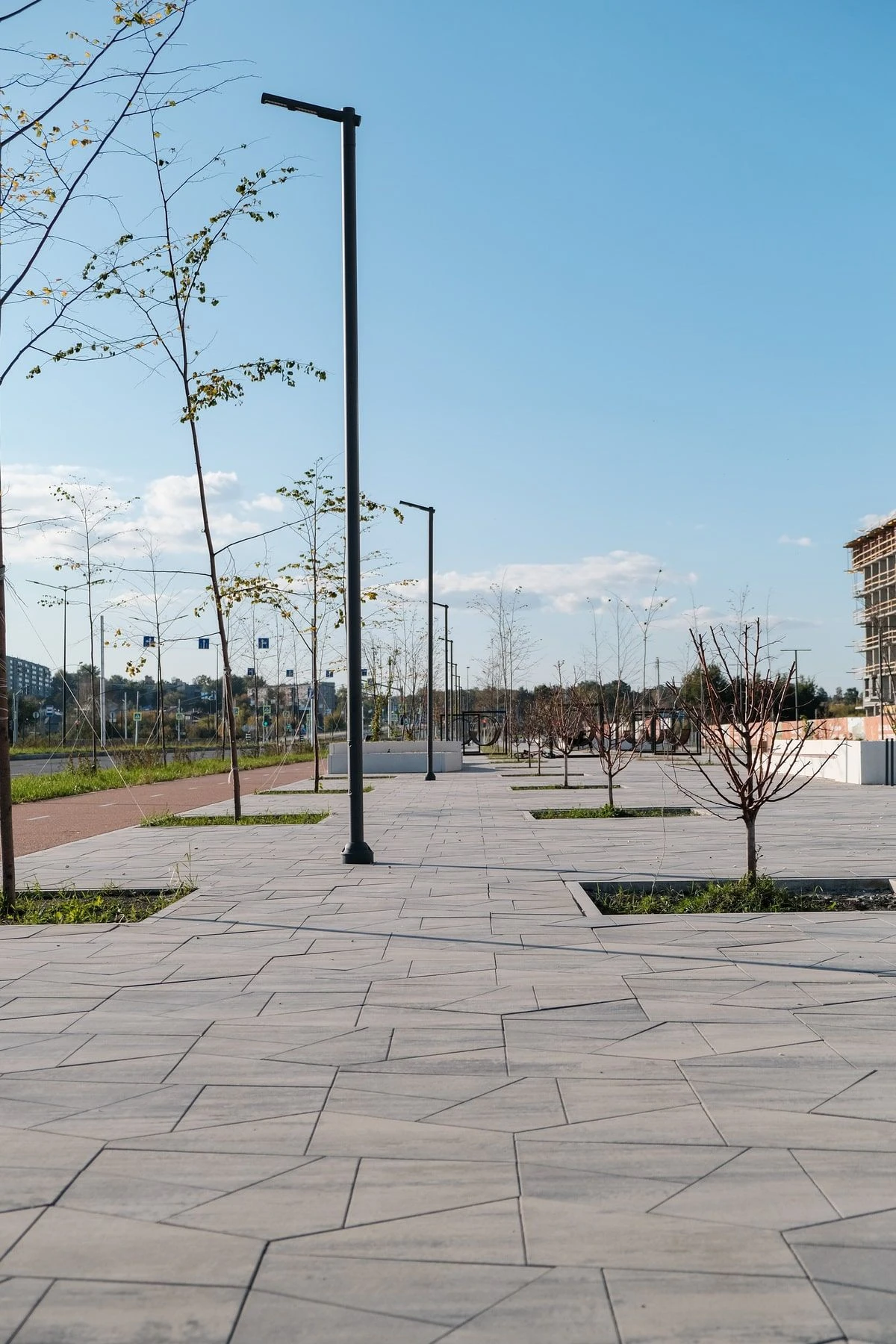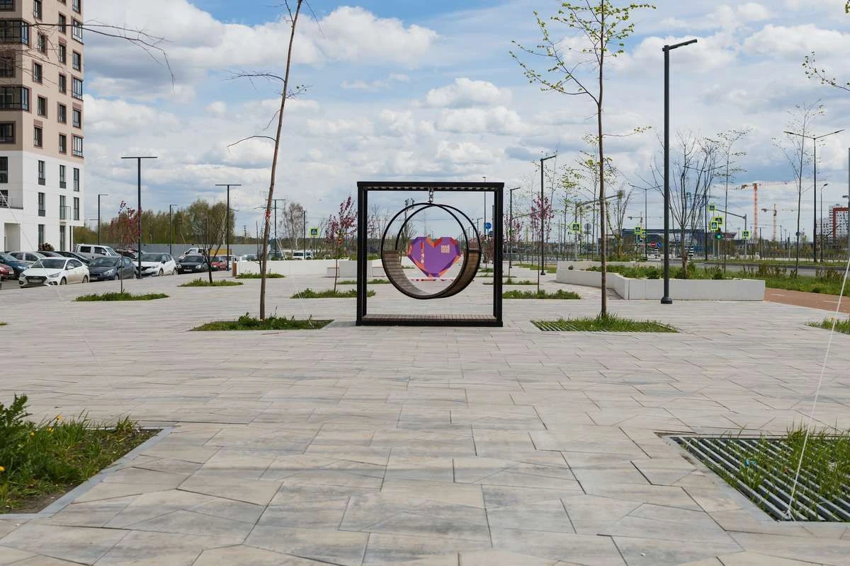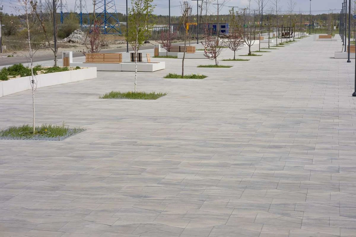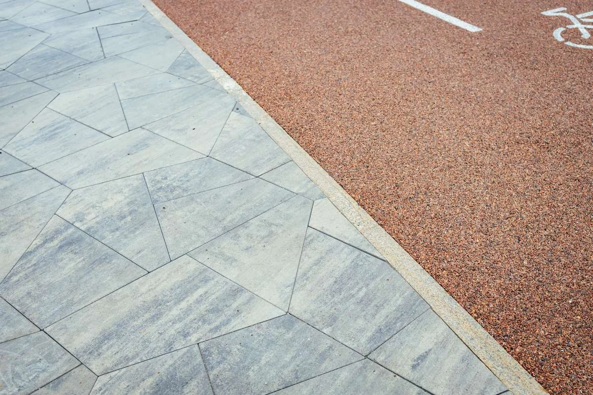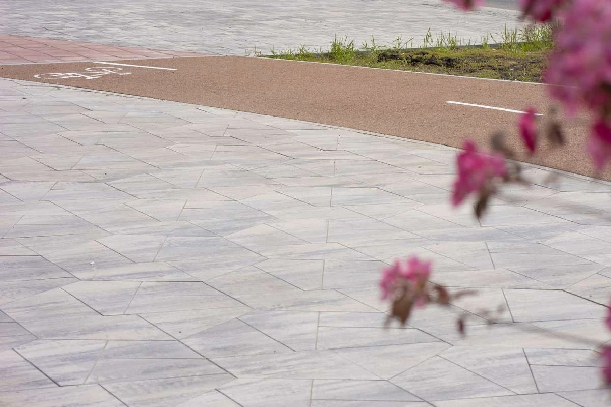 В укладке задействовали два вида тротуарной плитки «Поревит»: Мозаика и Старый город, обе в цвете Шунгит. Площадь поделена на две части с соответствующей кладкой. Дополнительно светлый цвет плитки позволяет ей контрастно отделяться от велодорожек, что может спасти в темное время суток, когда при вечернем освещении дорожки одинакового цвета не всегда различимы между собой.