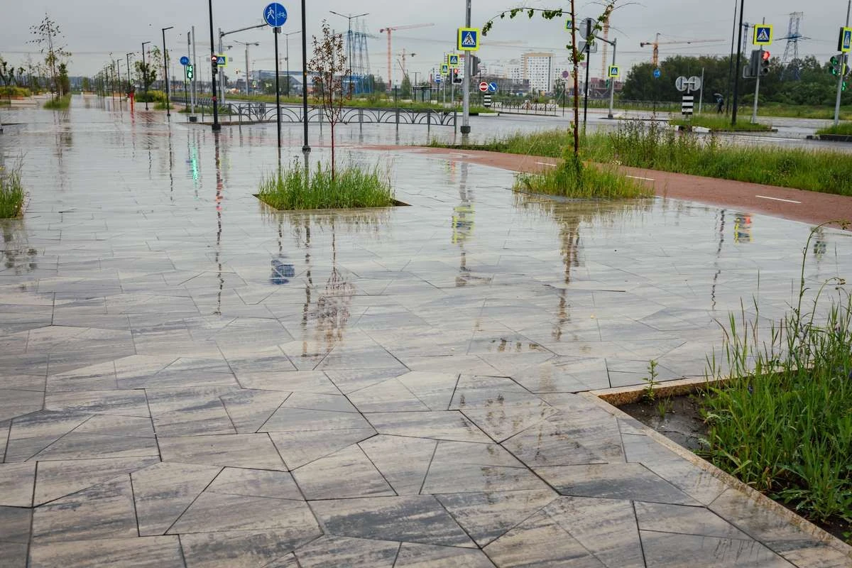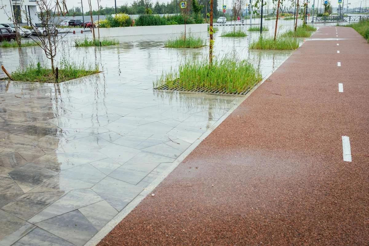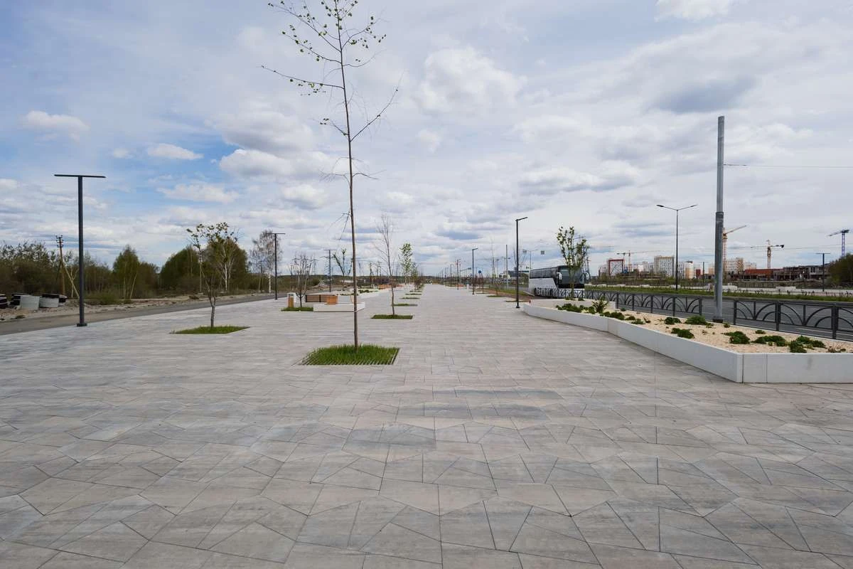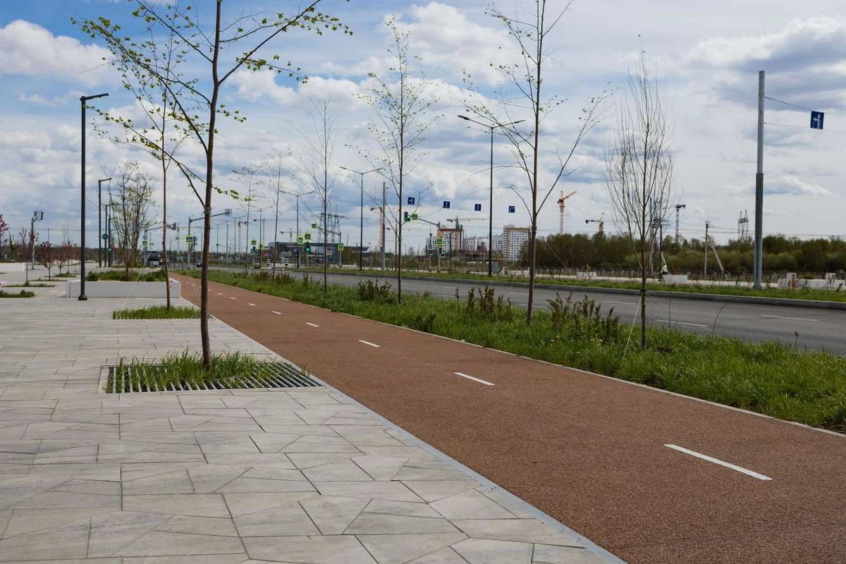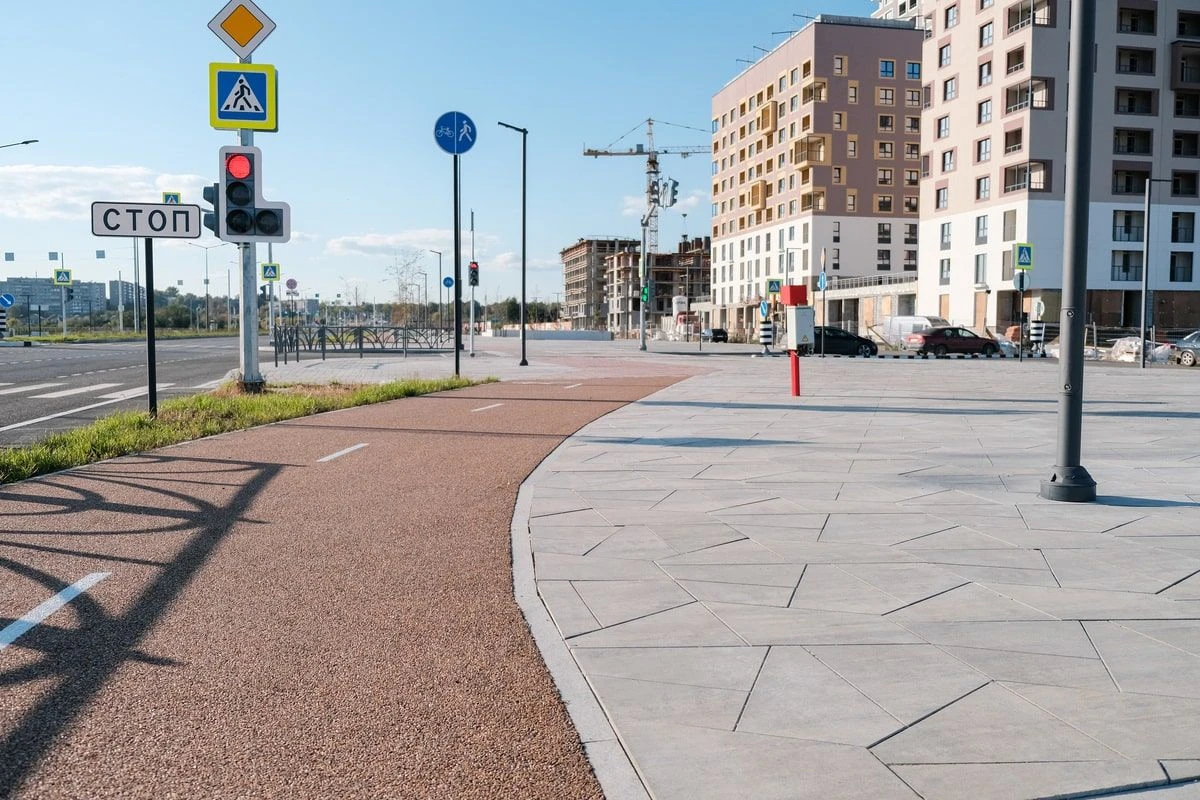 В укладке задействовали два вида тротуарной плитки «Поревит»: Мозаика и Старый город, обе в цвете Шунгит. Площадь поделена на две части с соответствующей кладкой. Дополнительно светлый цвет плитки позволяет ей контрастно отделяться от велодорожек, что может спасти в темное время суток, когда при вечернем освещении дорожки одинакового цвета не всегда различимы между собой.