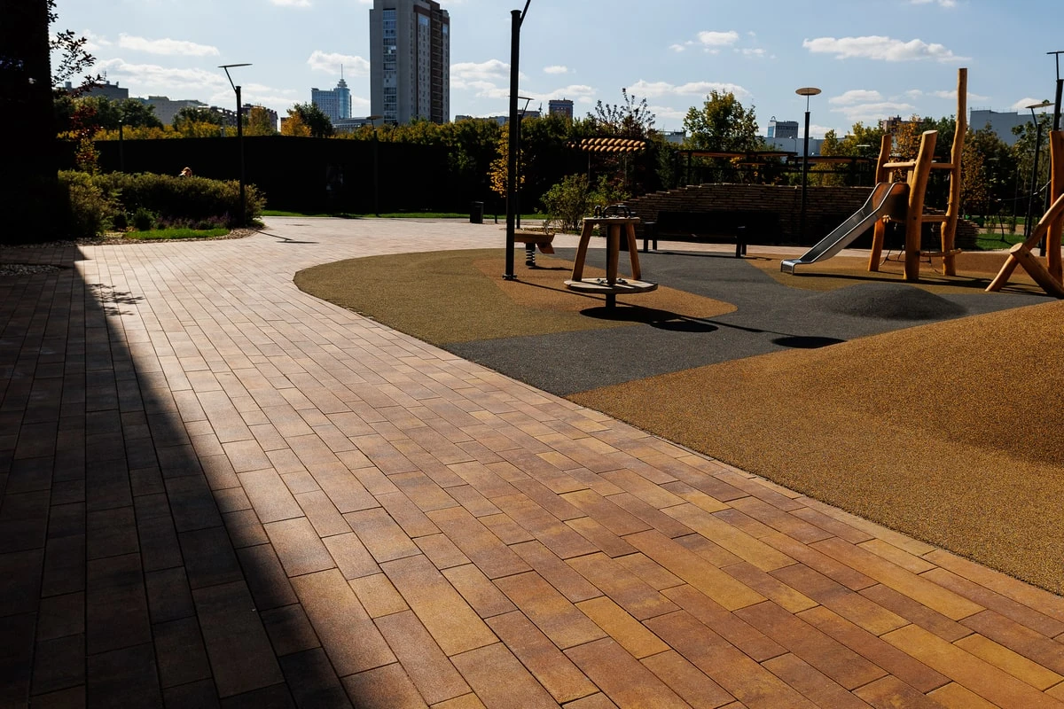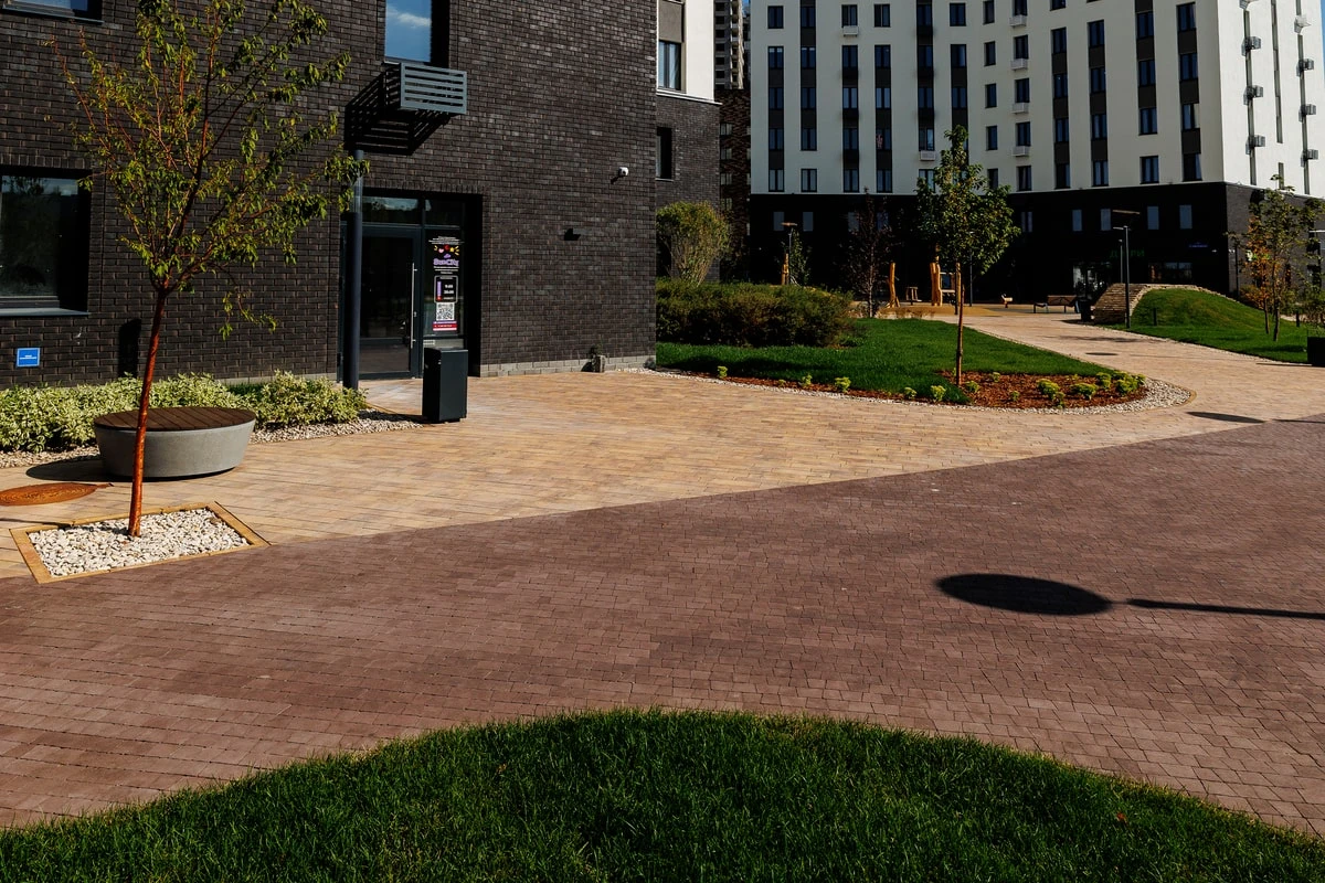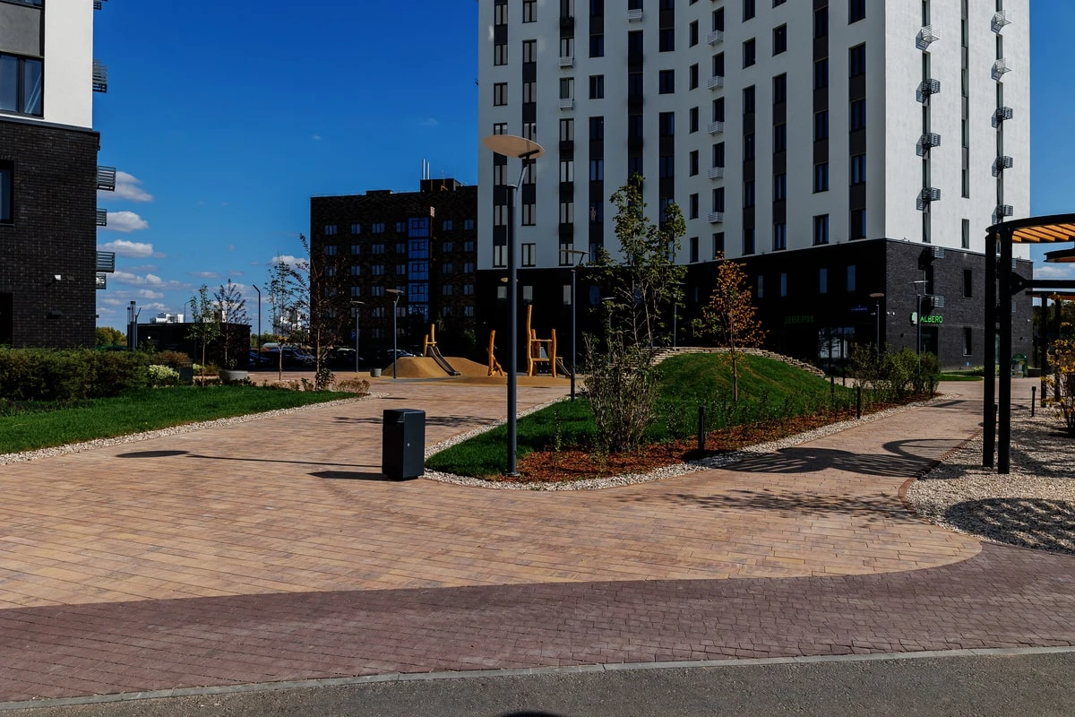 Для благоустройства дорожек в жилом комплексе использована тротуарная плита и бордюры: