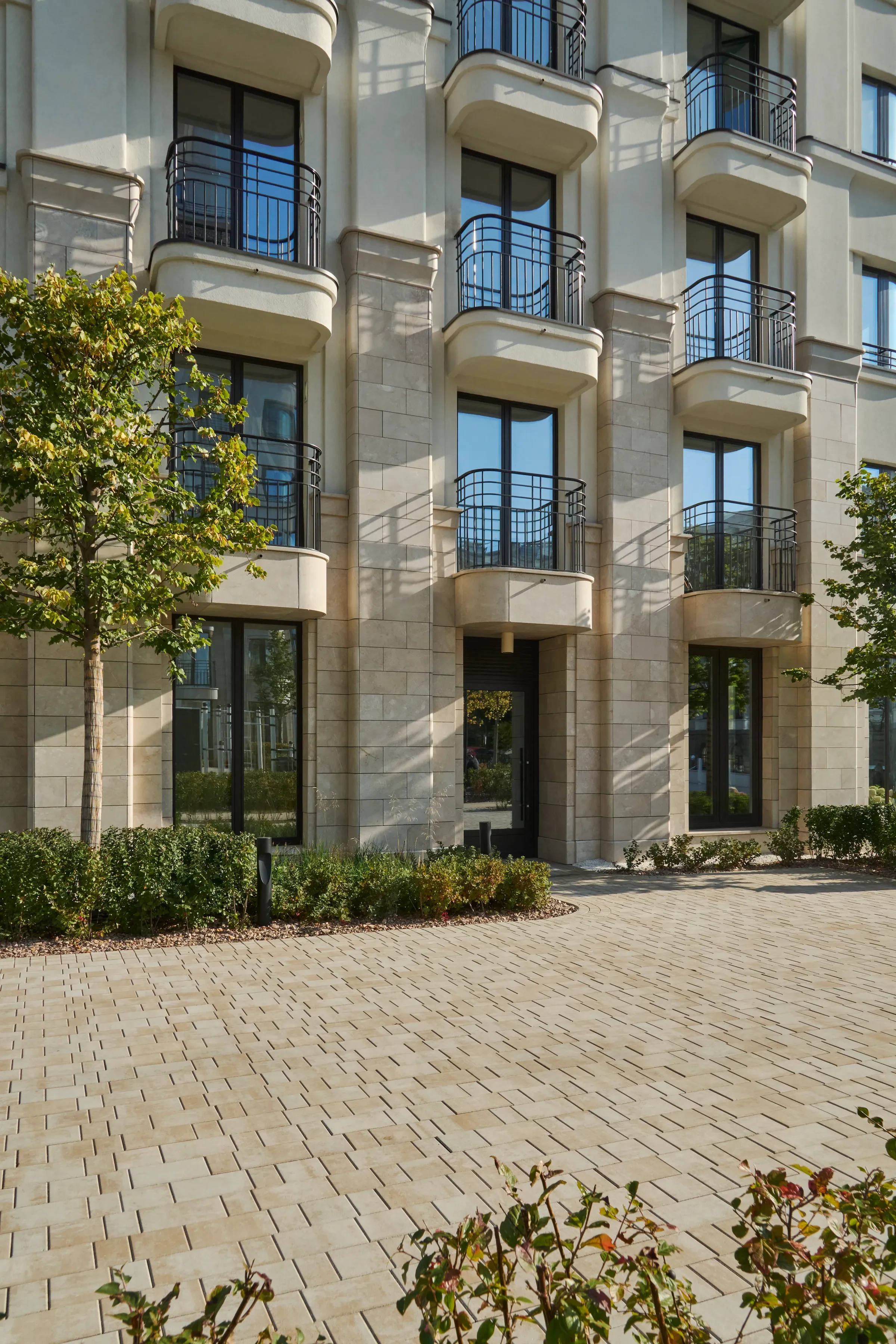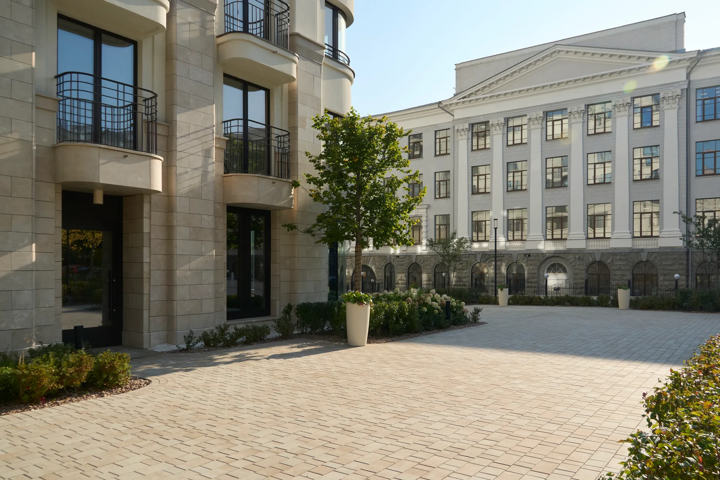 Песчаный цвет плиты идеально сочетается с фасадами домов.